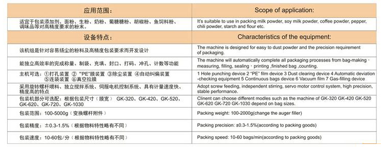 自动完成制袋,计量,下料,封合,分切,计数等功能,适用粉末物料的自动计量包装机。
